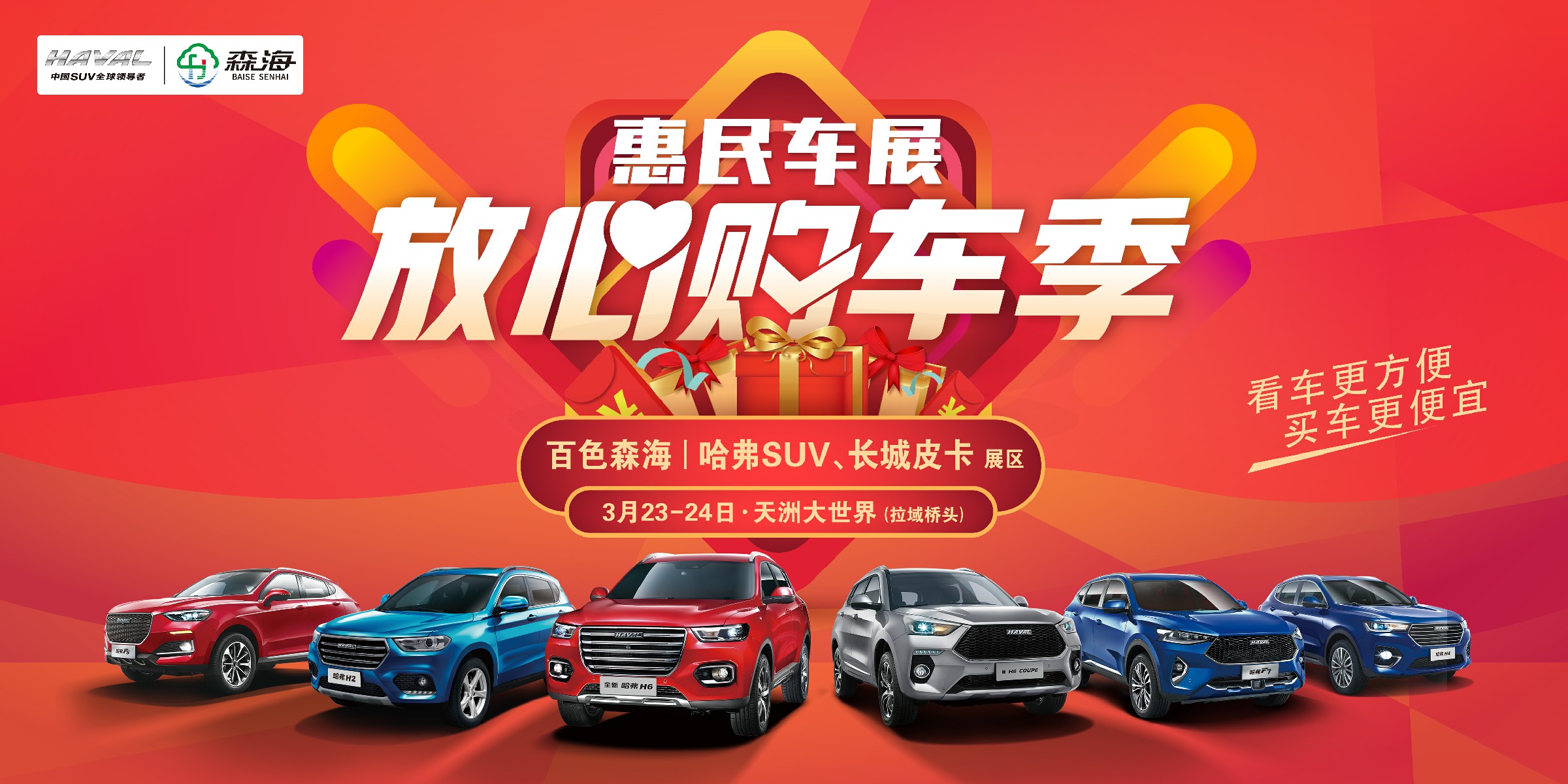 百色第四屆惠民車展 3月23-24日,天洲大世界 百色森海 哈弗SUV、長(zhǎng)城皮卡 品牌 誠(chéng)邀您蒞臨,給您放心價(jià) 這個(gè)購(gòu)車季,瘋狂底價(jià)購(gòu)